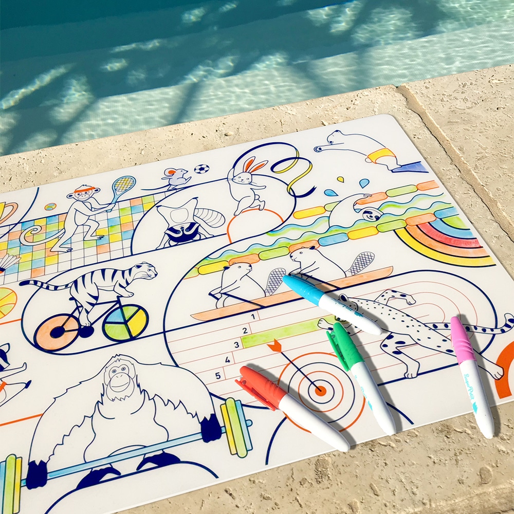 Ce coloriage pour enfant met ses petits champions à l’honneur avec ce tapis de coloriage réutilisable sur le thème du sport olympique.